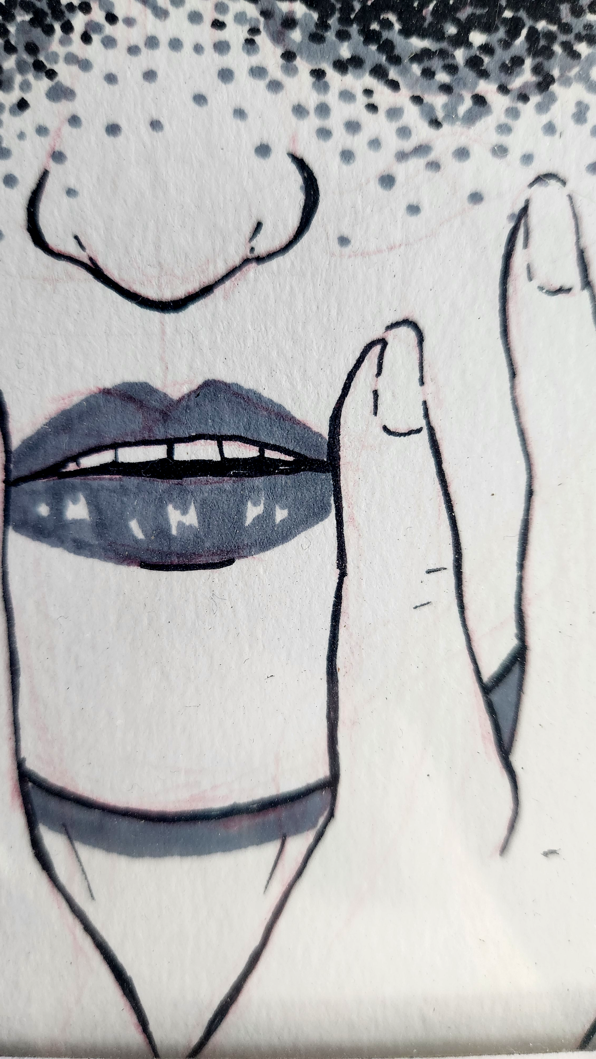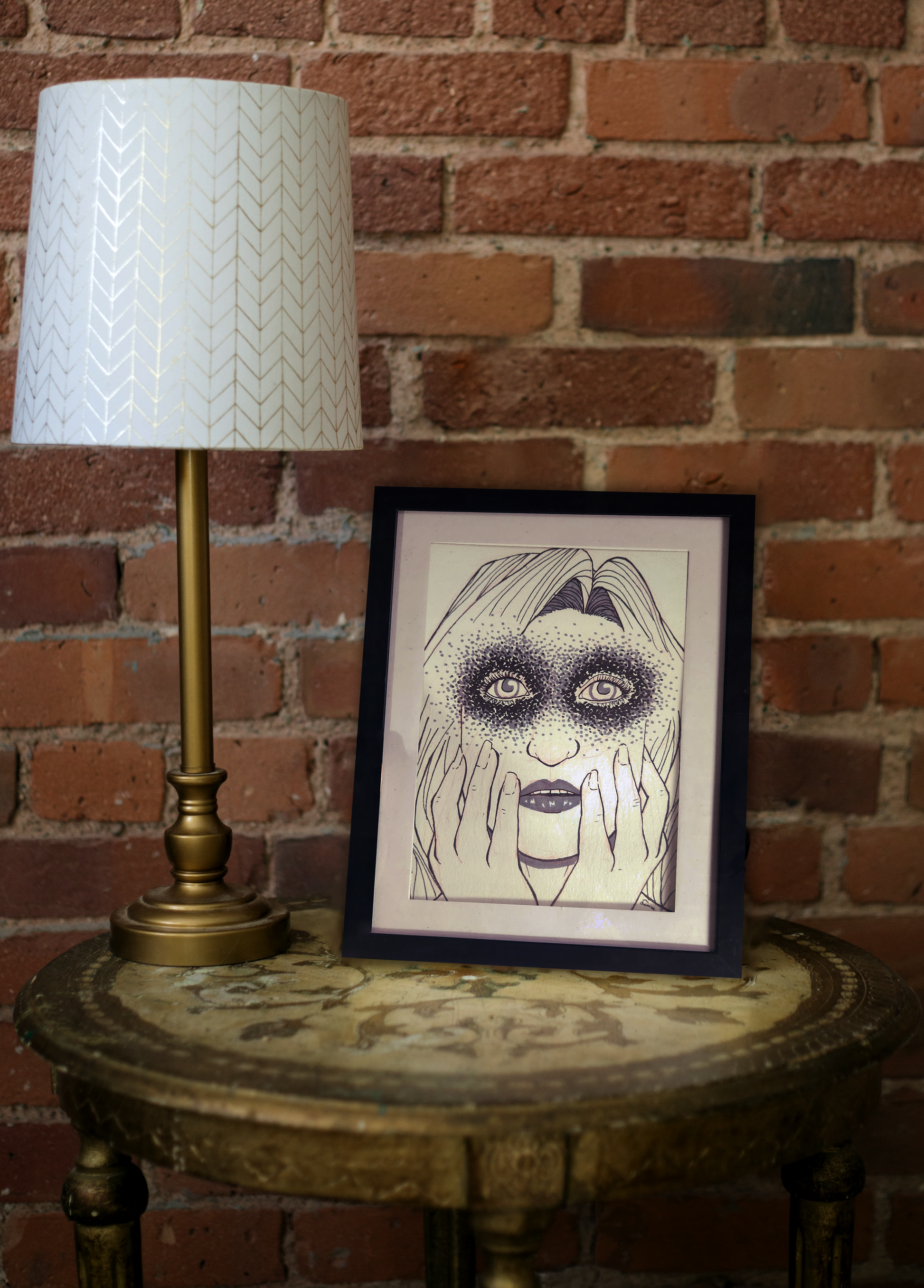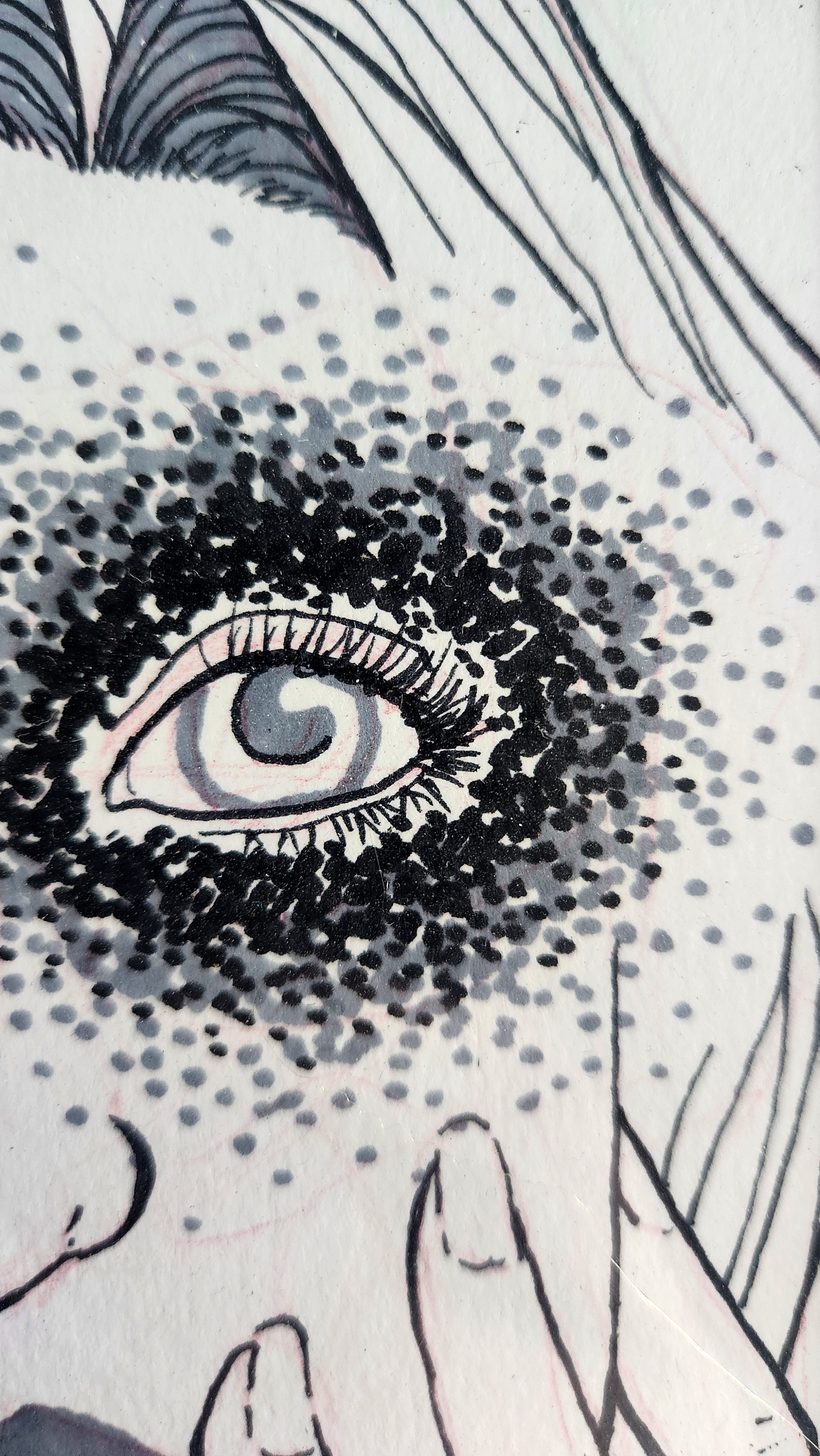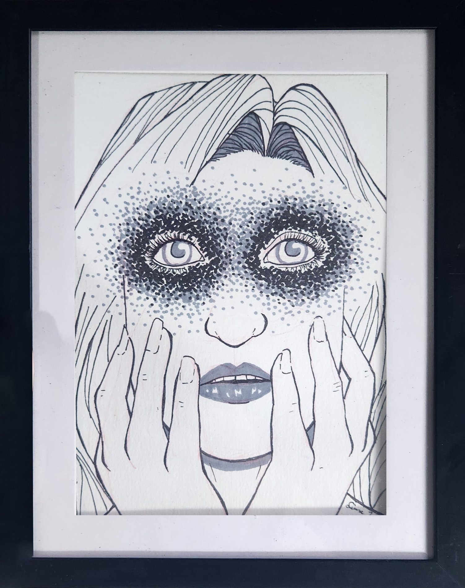 5in x 7in black and grey ink drawing framed in a black frame with matting.