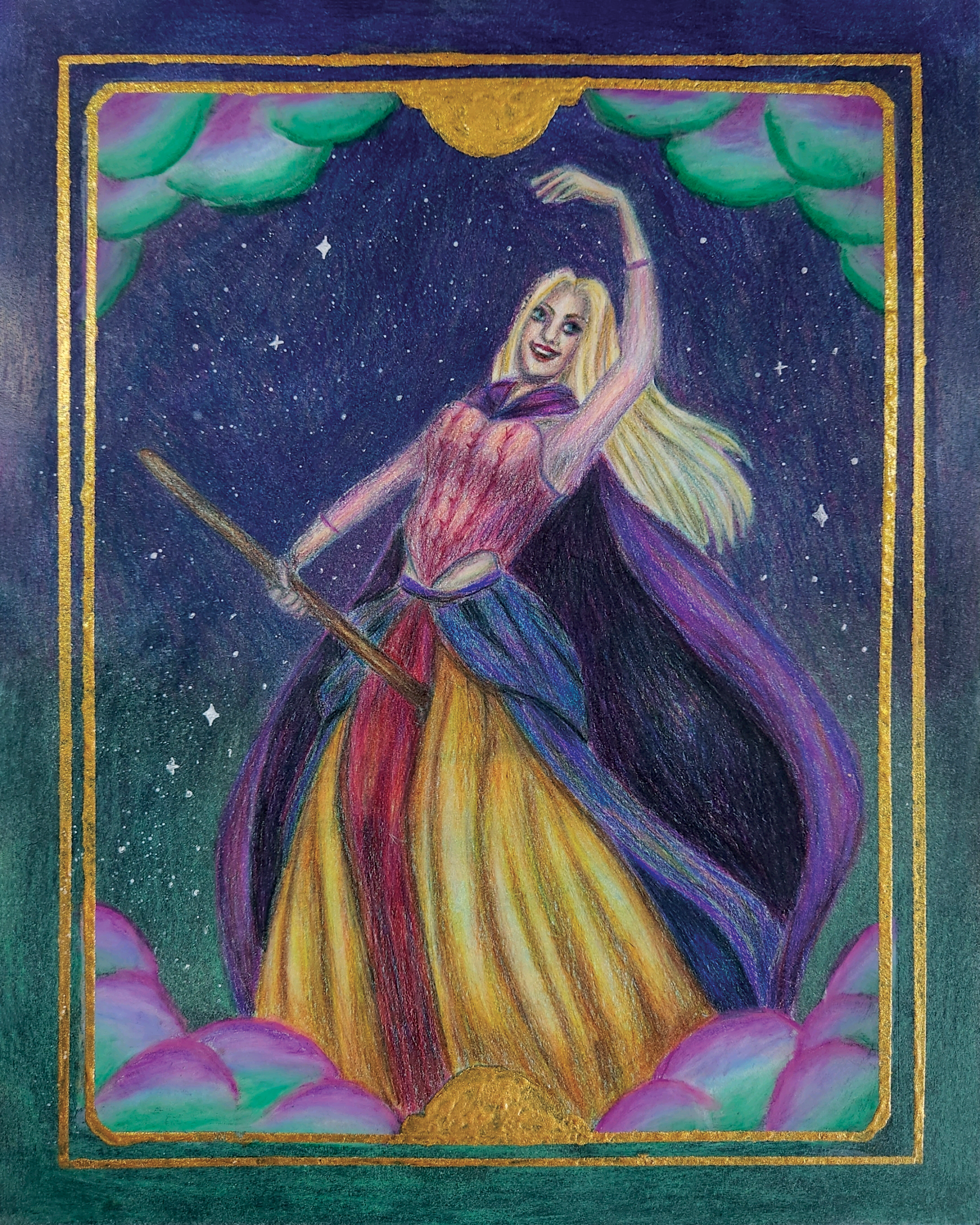 8in x 10in oil paint and color pencil portrait of Sarah with gold paint.