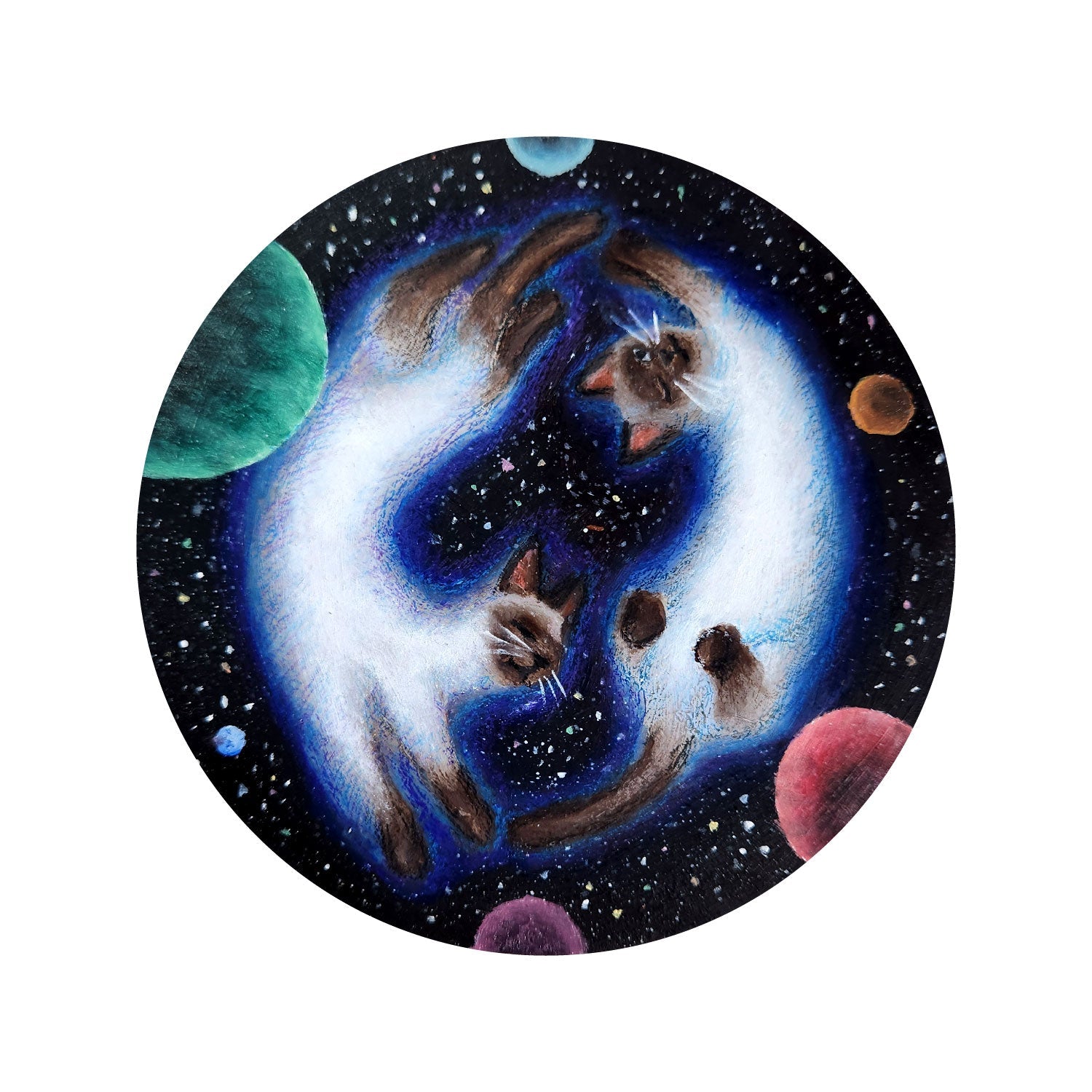 This cat sun is the final of five in my Cat Galaxy series. These cats represent the binary solar systems which host two stars orbiting each other. These systems have planets and asteroids orbiting around the two suns just like our system does with one sun.