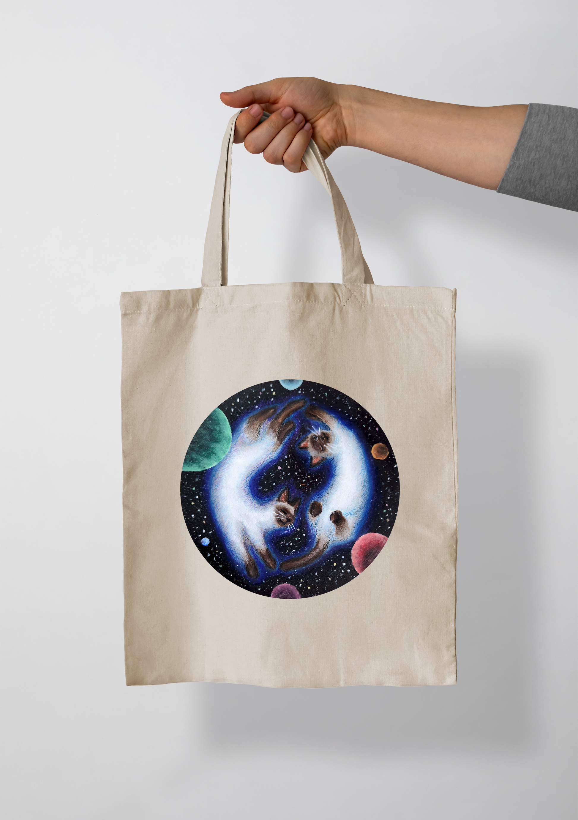 Tote bags are 12inch by 15inch and are made of canvas. Each tote bag is handpressed with the Galactic Cat image.