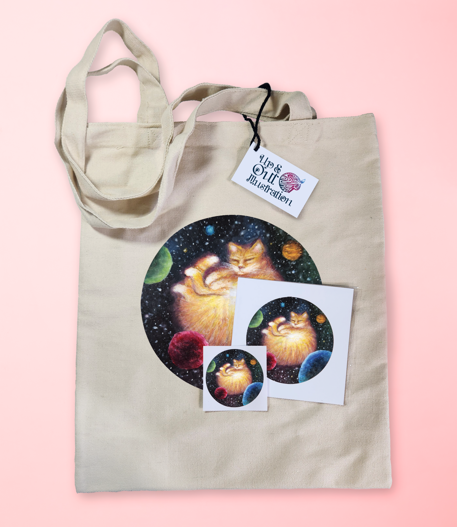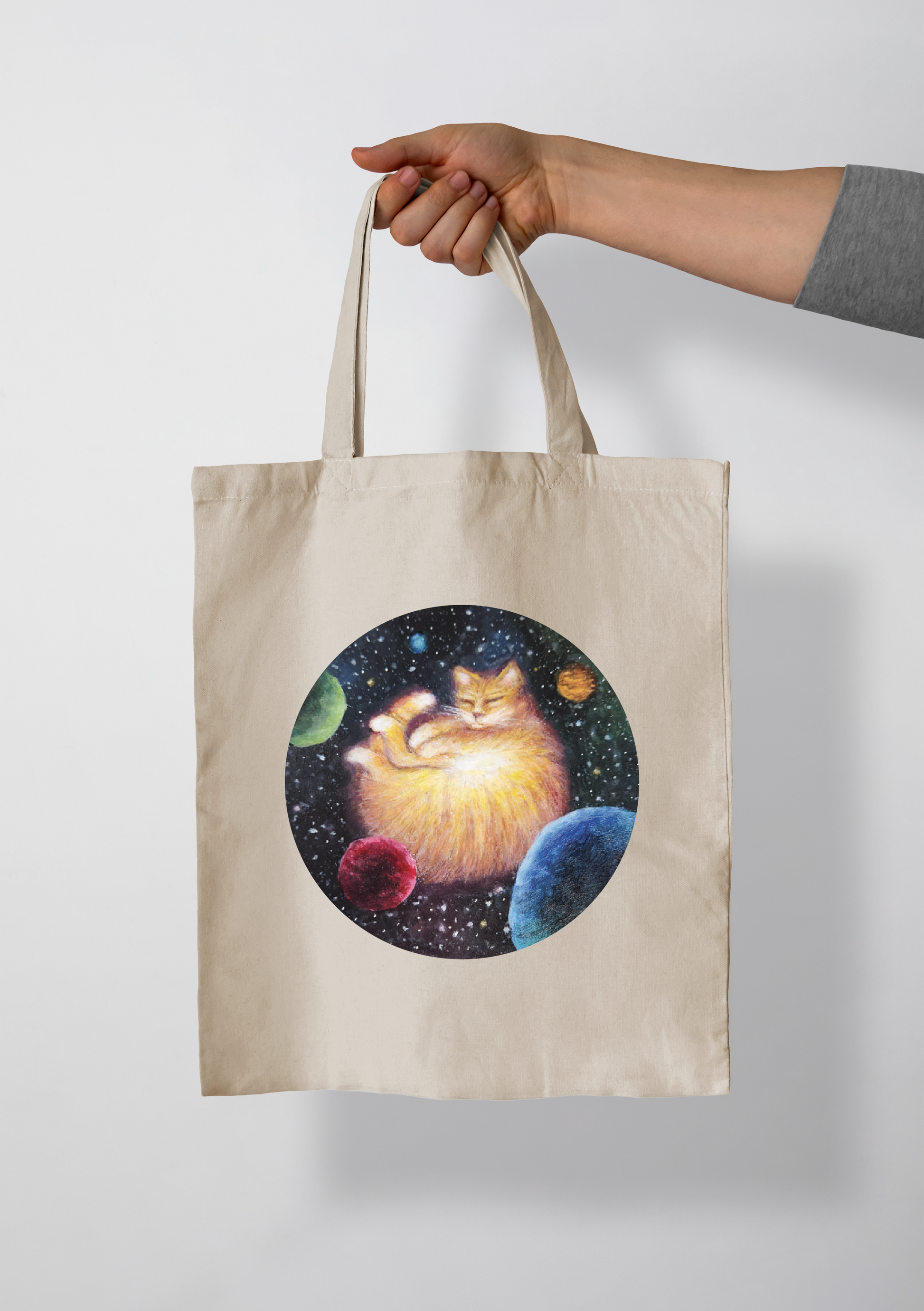 Tote bags are 12inch by 15inch and are made of canvas. Each tote bag is handpressed with the Galactic Cat image.