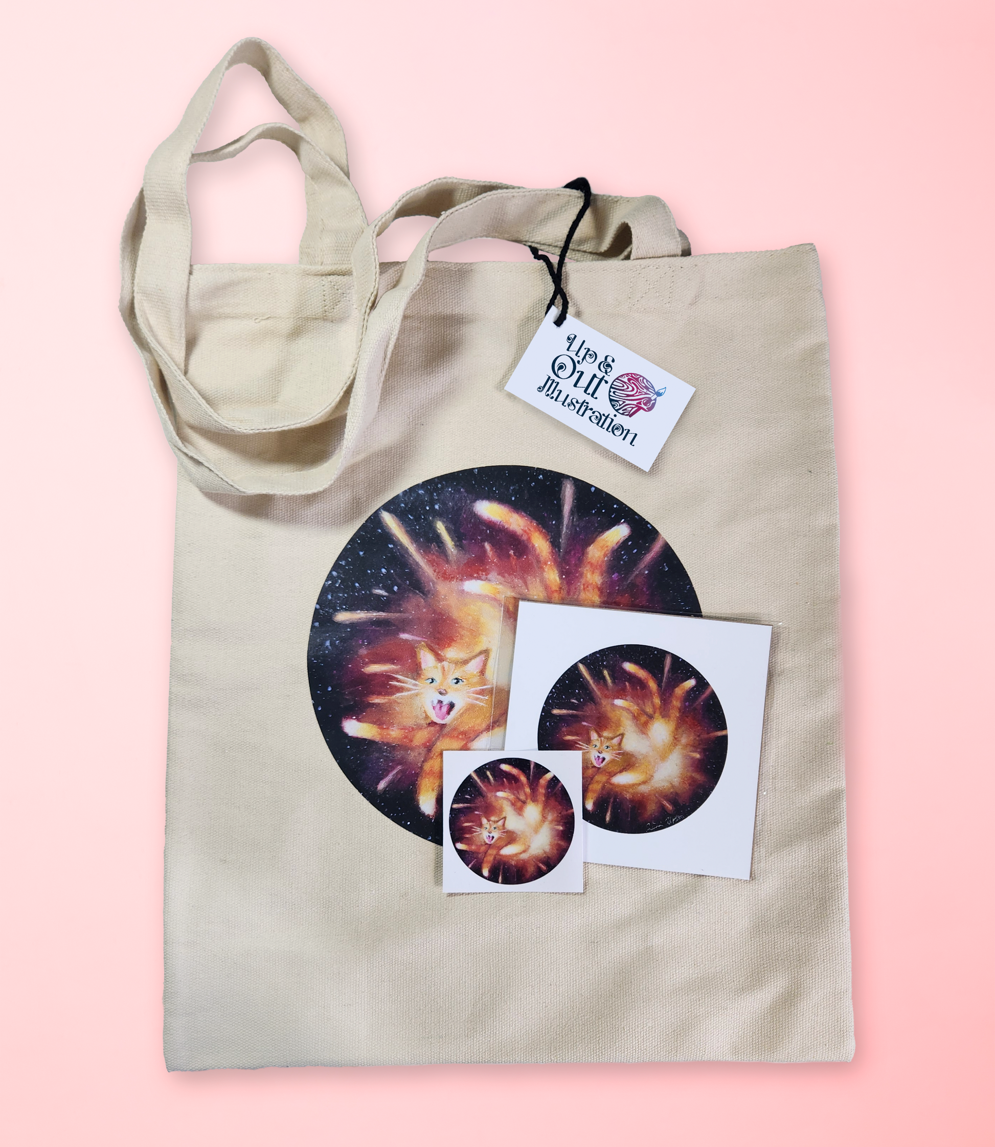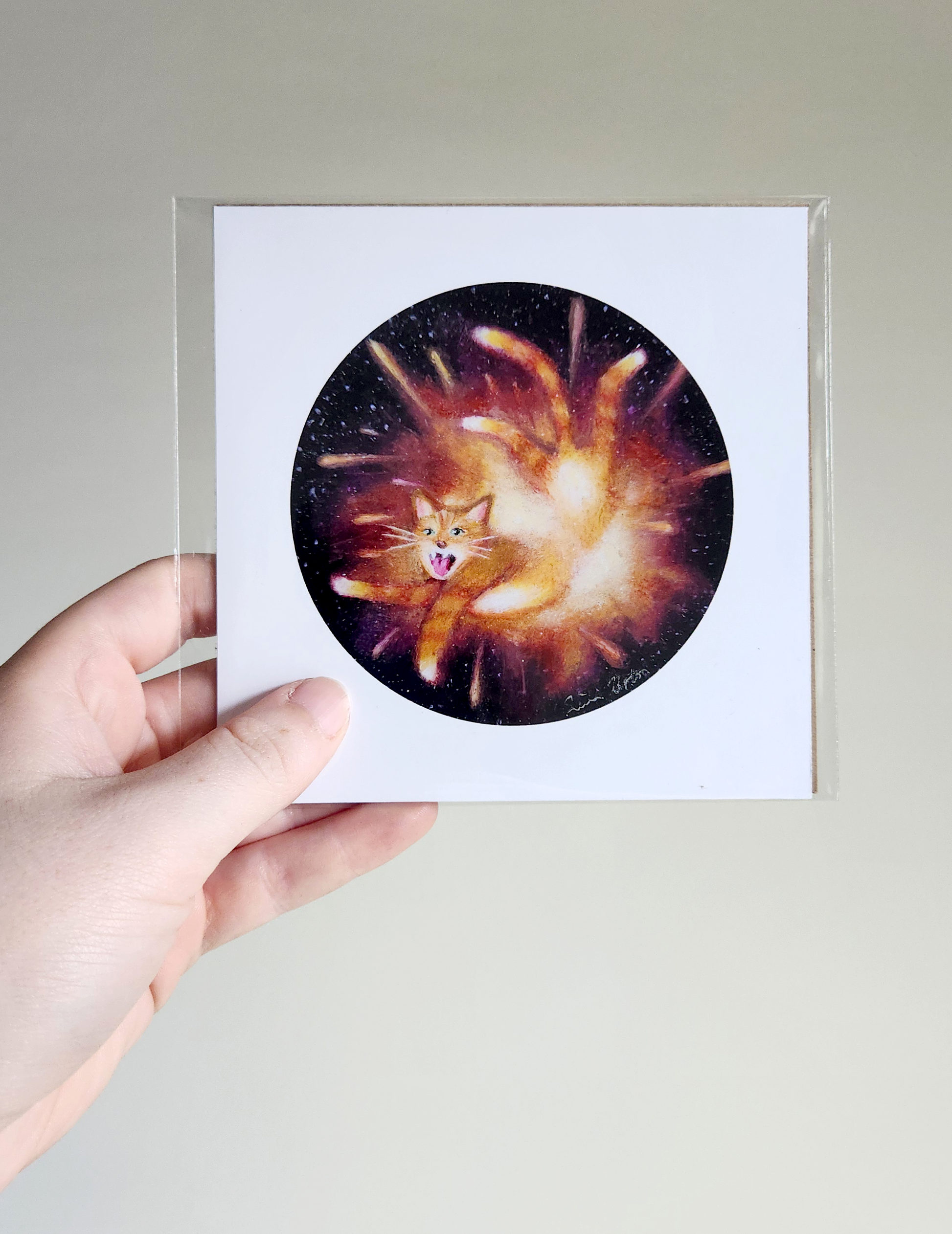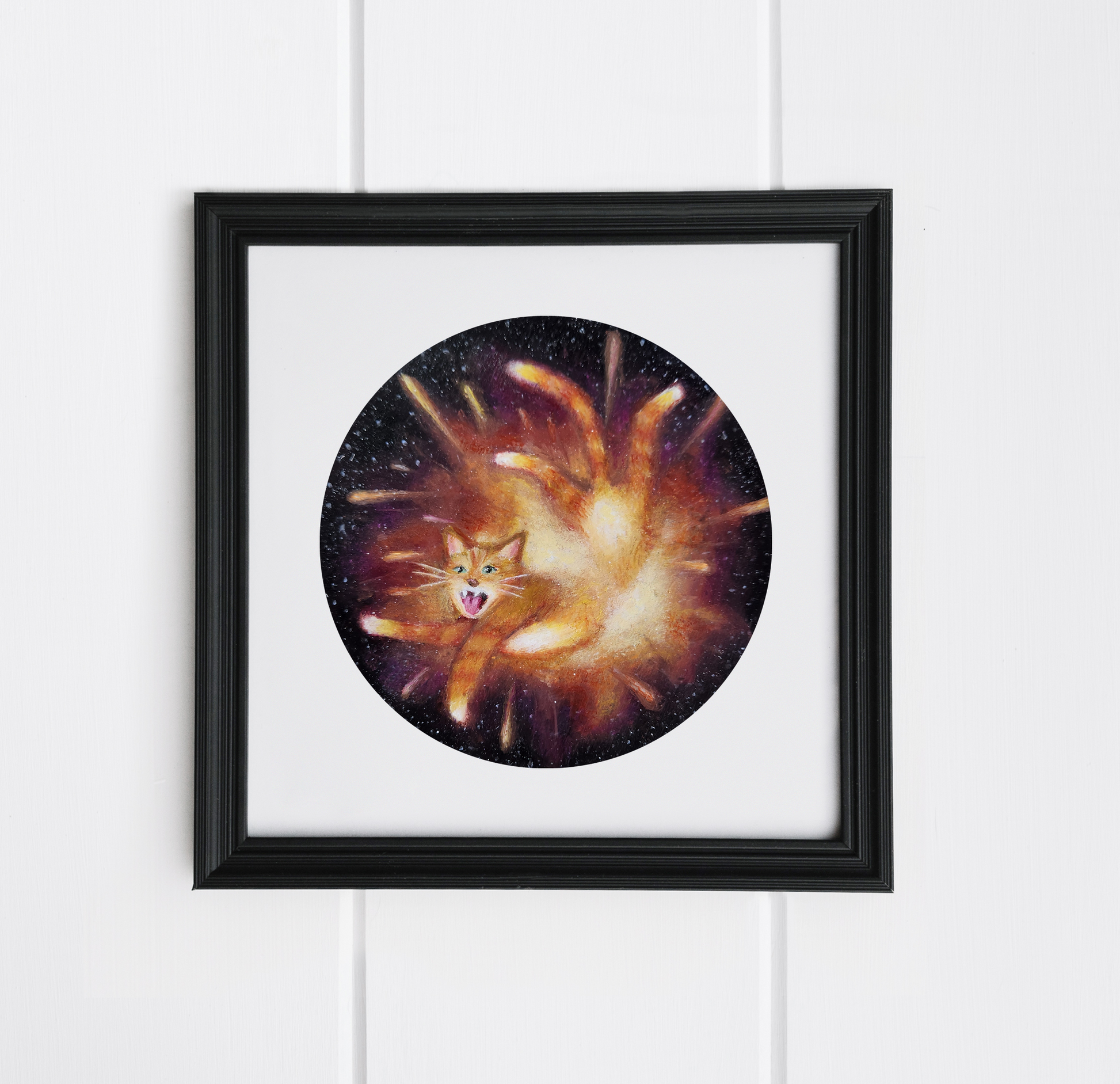 Based off my own orange tabby cat, Quizzie, this cat sun is the third of five in my Cat Galaxy series. This cat represents a supernova, which is when a star explodes and loses most of its energy. The star either becomes a blackhole or a blue dwarf star.