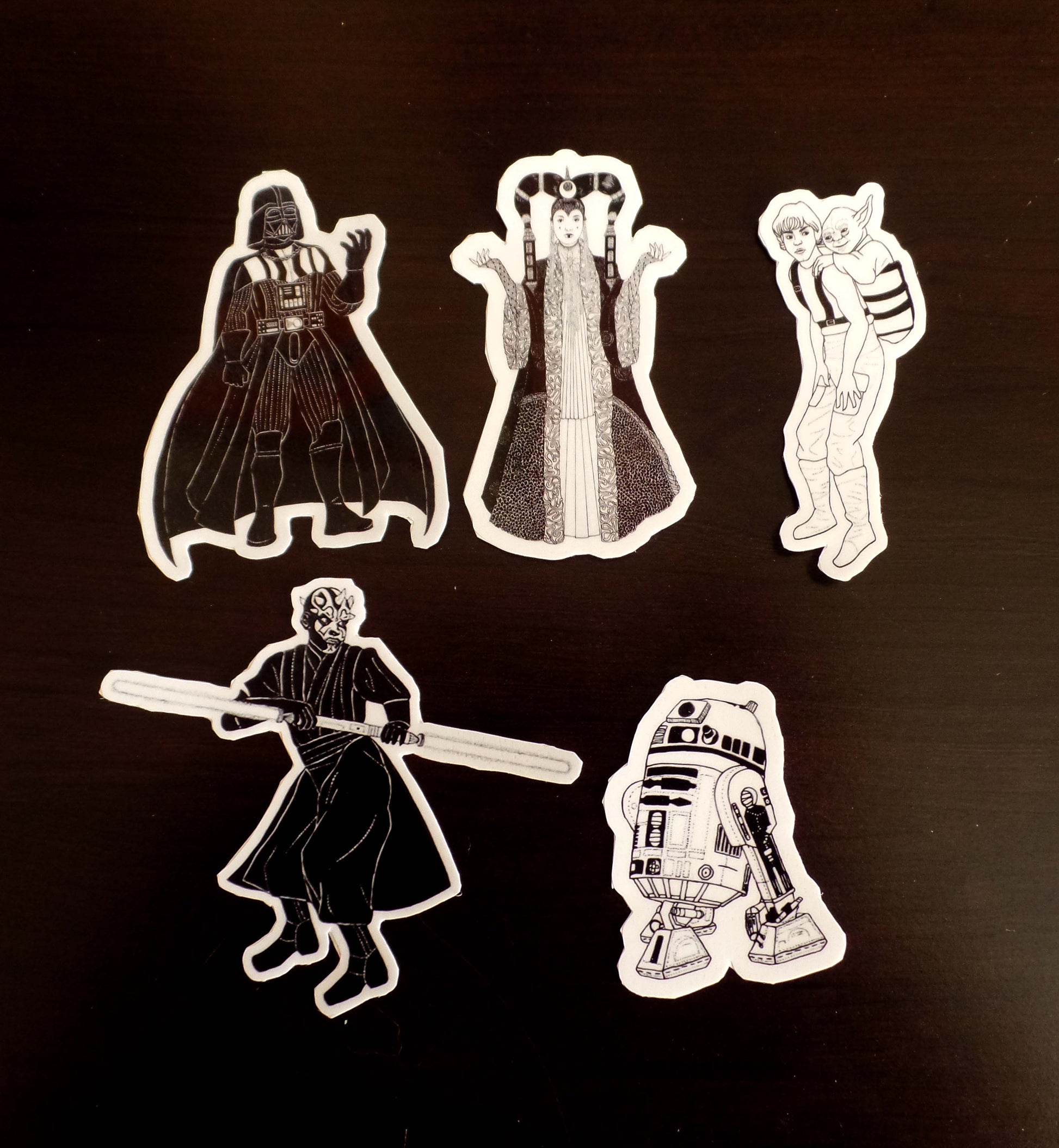 Pack includes one of each sticker: Padme Amadala, Darth Vader, Luke Skywalker with Yoda, R2D2, and Darth Maul with lightsaber