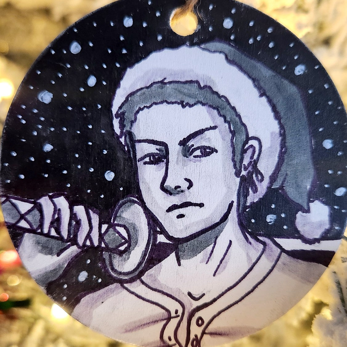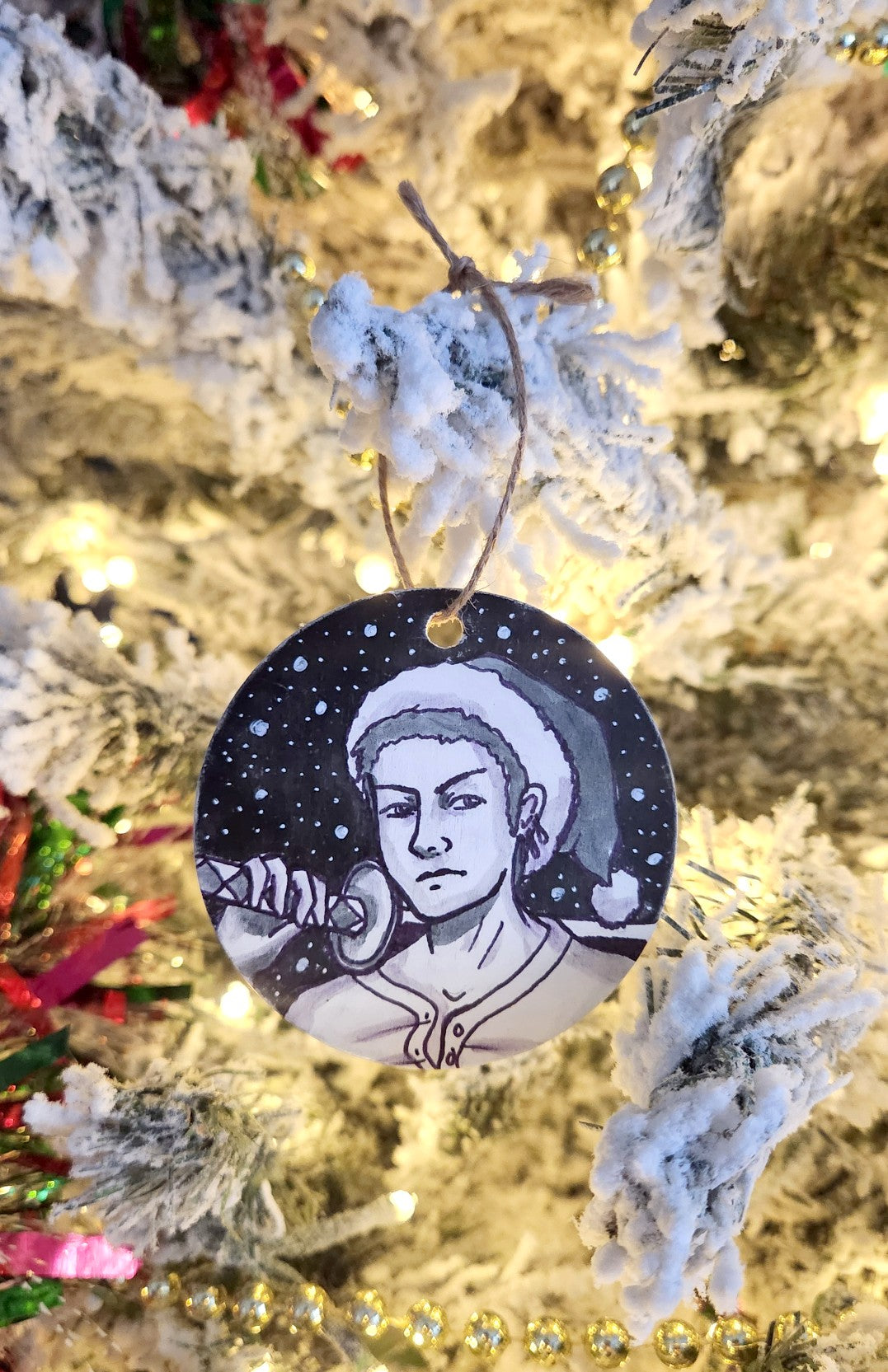 Black and white ink drawing on 2.5 x 2.5 inch white gesso wood ornament. Comes with 2.5 inch tied twine for hanging. Image is finished with matte varnish for glare-free protection.